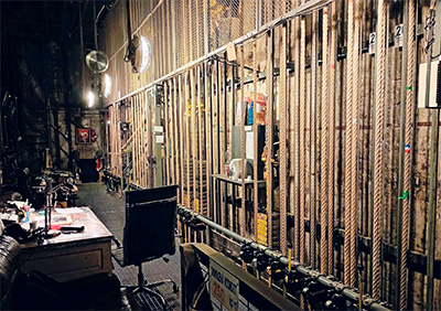 Pohled na provaziště, vpravo jsou konopná lana,přes která jsou ovládány tahy.Provaziště je jedno z divadelních pracovišť, která diváci nikdy neuvidí. Můžete ho představit?